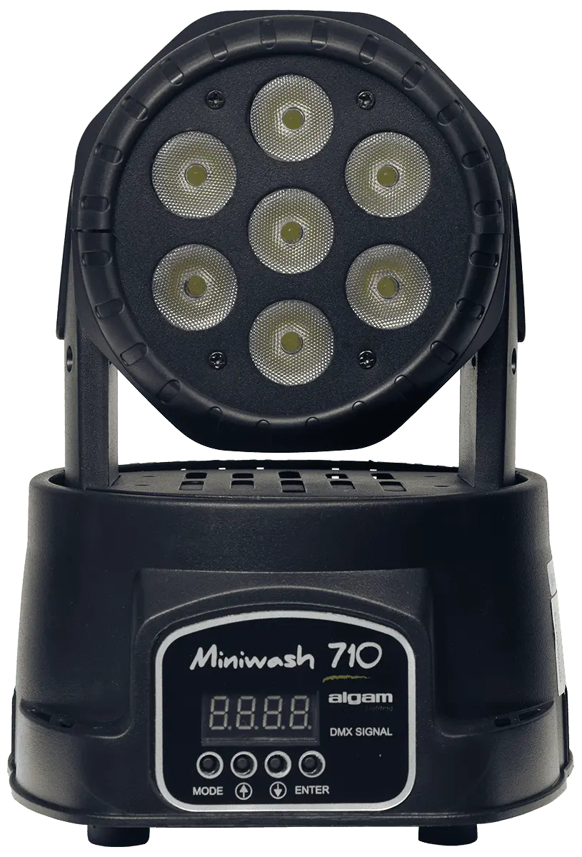 Powerful but compact, the wash moving-head MINIWASH 710 from Algam Lighting has 7 RGBW LEDs for generous and warm light beams. Packed with features for amazingly energetic effects, operating in automatic, music-controlled or DMX mode, it has quiet and stealthy motors that offer pan up to 540° and 270° tilt, ensuring a variety of head-turning moves.