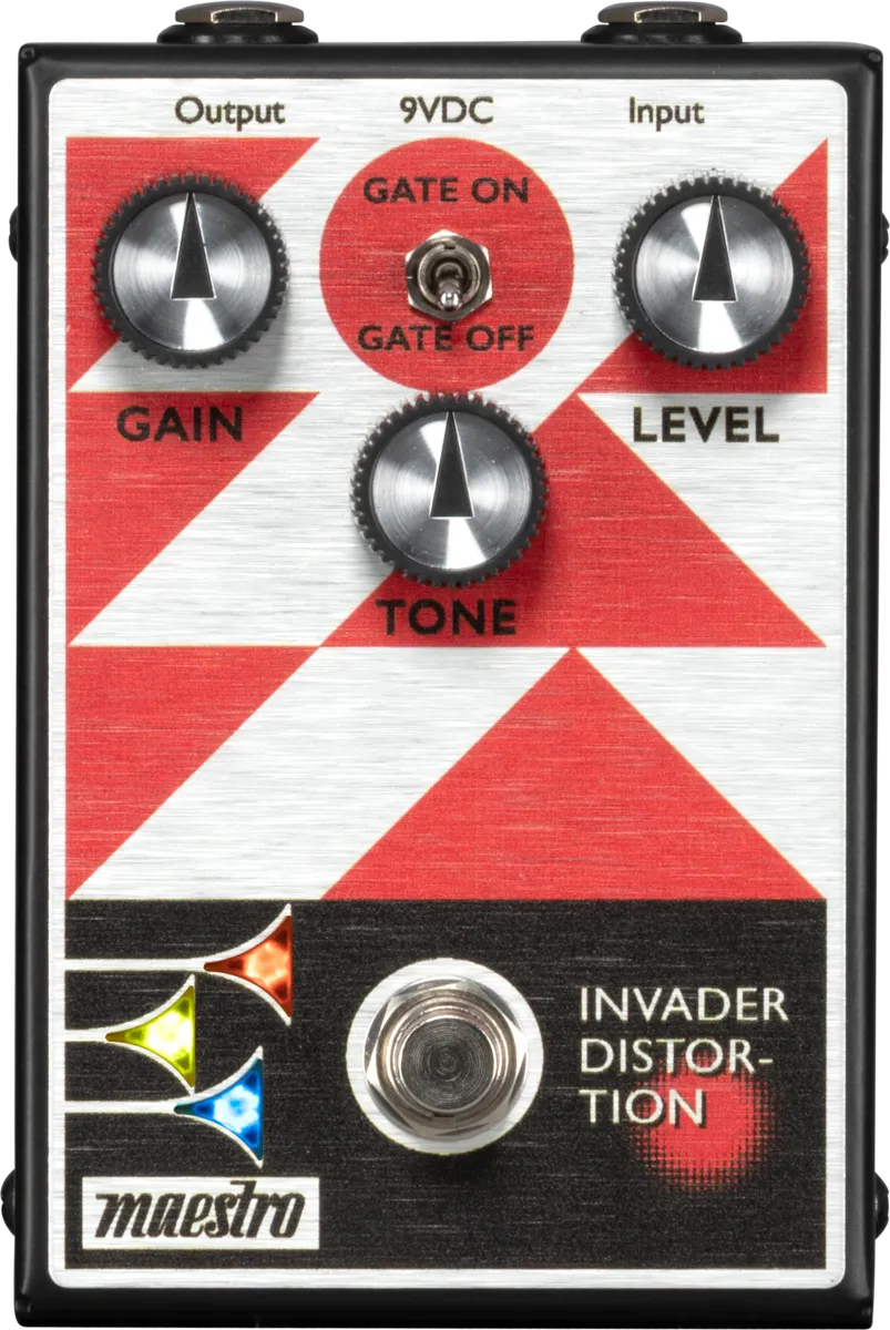 The Maestro Invader Distortion is a high-gain, all-analog modern distortion pedal with a heavy, aggressive, dominant sonic character and loads of rich harmonics. With the Maestro Invader Distortion, users can generate a wide range of distorted sounds. The 3-knob control layout gives users intuitive control over Gain (distortion amount), Tone, and output Level, with more than enough volume on tap to easily exceed unity gain when you want to. Users can also engage a built-in noise gate with the top panel toggle switch. An internal trim pot mounted on the circuit board inside the pedal allows the user to adjust the level of the noise gate's Threshold. The true bypass footswitch triggers the LED lights in the bugles in the Maestro logo when it’s on, so you’ll always know when the effect is active.