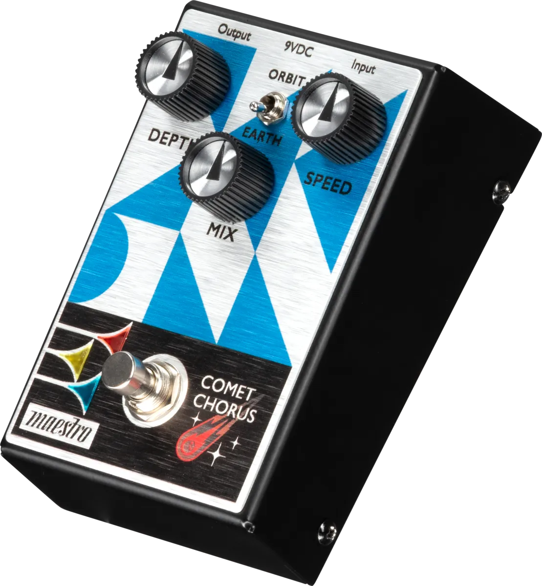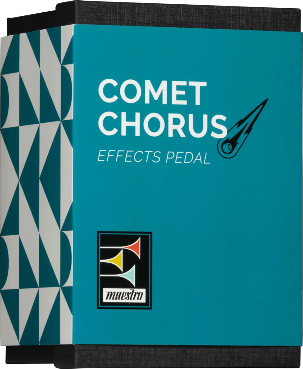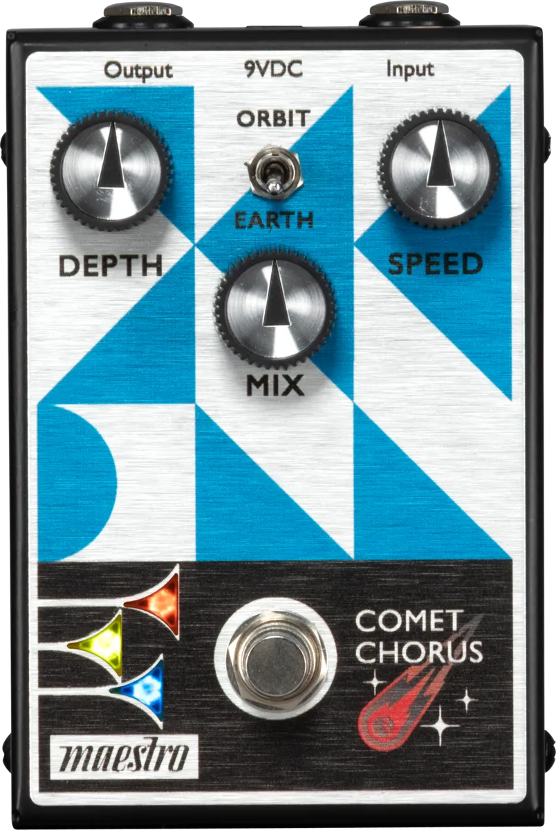 The Maestro Comet Chorus pedal uses iconic analog bucket brigade device (BBD) technology to deliver warm, classic chorus tones. This all-analog pedal boasts a Mode toggle switch for increased sonic versatility. The Earth mode provides an optimized, shimmering chorus effect. The Orbit mode adds some amplitude modulation to the chorused sound to more accurately simulate the sonic complexities of a rotary speaker. An internal trim pot lets you adjust the level of the rotary speaker Orbit effect to taste. The intuitive 3-knob control layout lets users quickly dial up the Depth (amount of pitch variation), Speed (modulation rate) of the chorusing, and adjust the amount of pitch modulated signal that is blended in with the dry signal by using the Mix control. The true bypass footswitch triggers the LED lights in the bugles in the Maestro logo when it’s on, so you’ll always know when the effect is active.