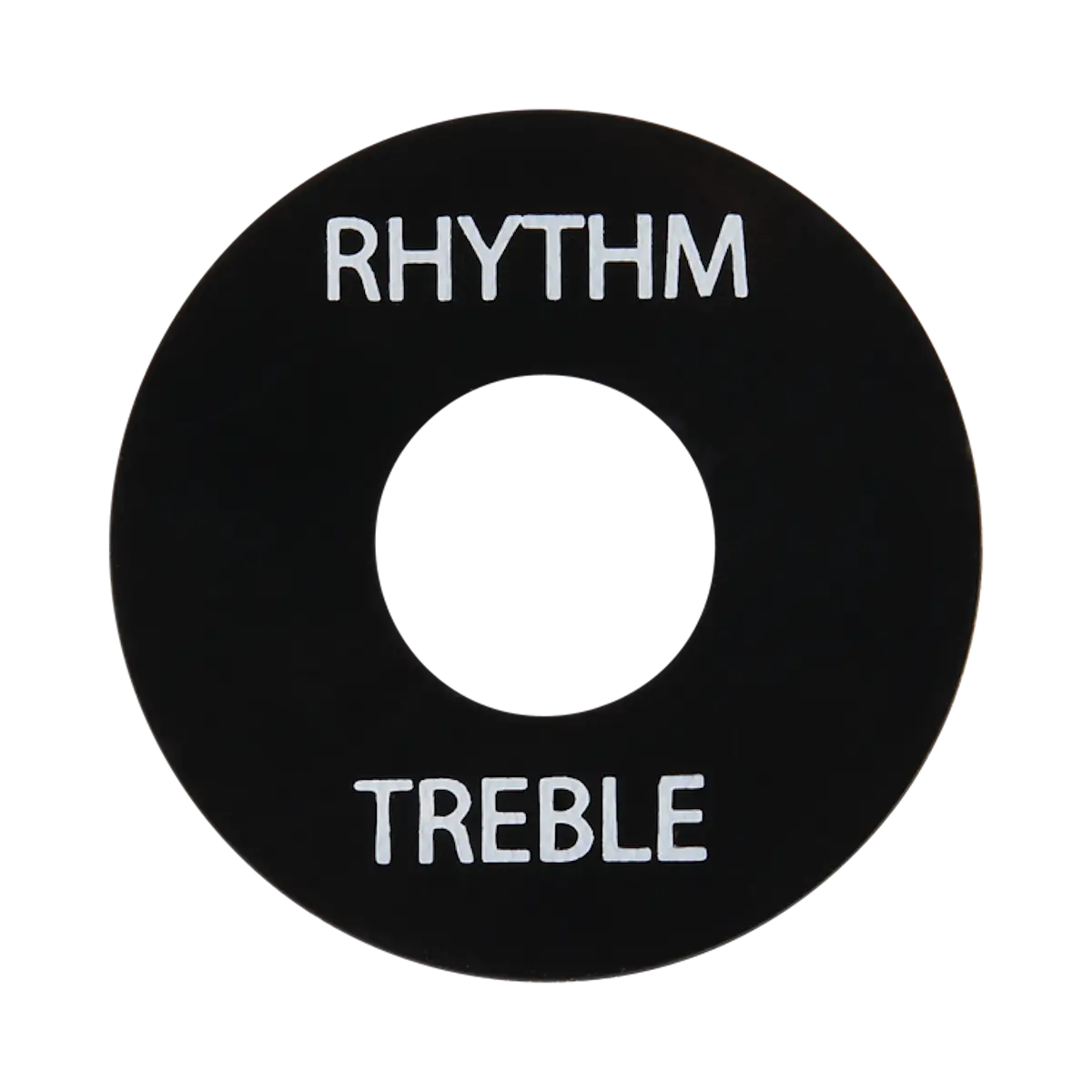 An exact replacement for worn out toggle switch washers, securely fitting over the switch shaft and held in place by the nut. This OEM part is made from ABS plastic and available in either black or crème, both with the gold imprinted letters "RHYTHM" and "TREBLE".