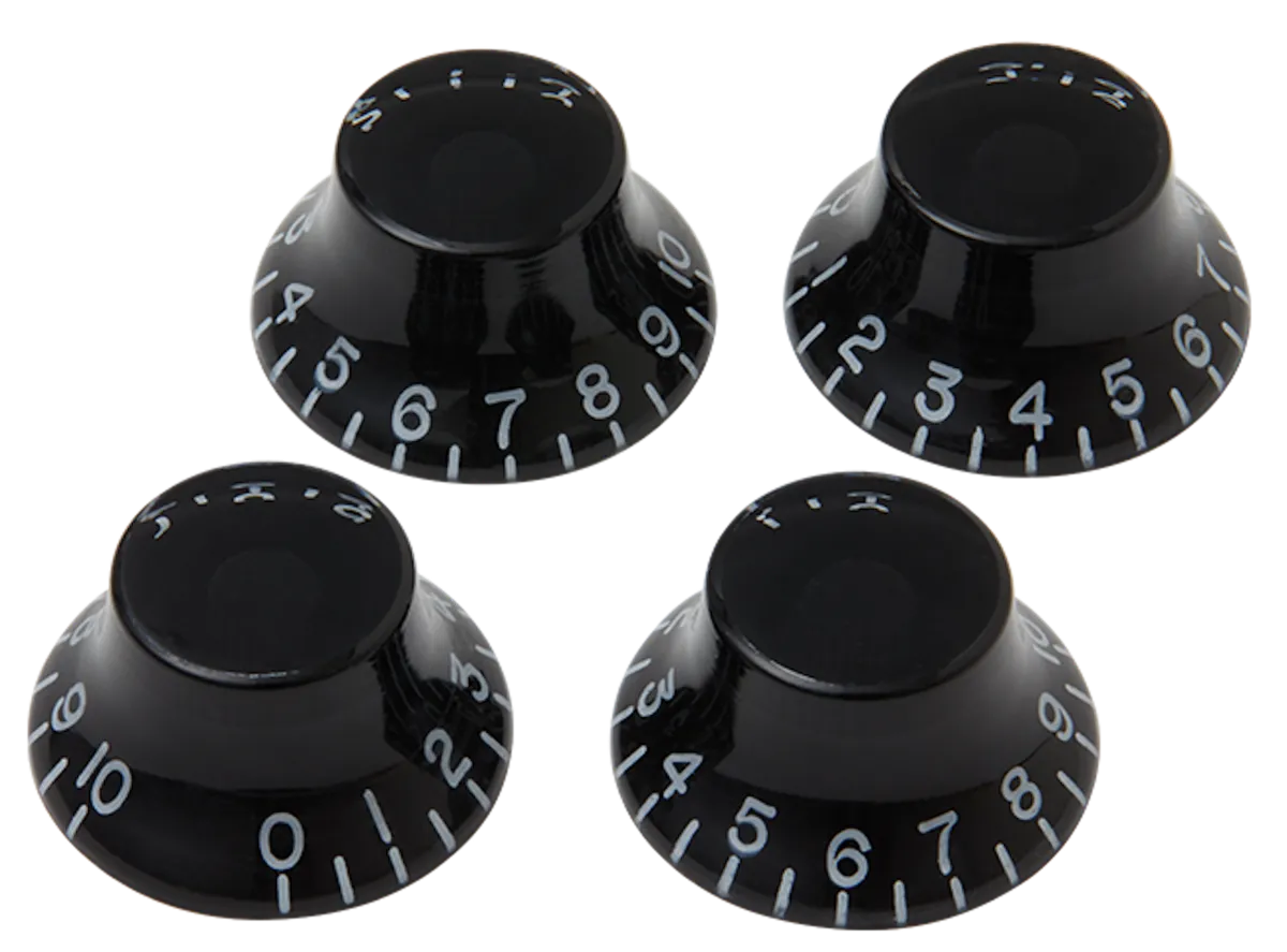 These genuine Gibson OEM top hat style knobs are the same knobs found on many vintage and current Gibson guitars, and can be used for vintage restoration or the replacement of lost knobs. Gibson top hat knobs come packaged in sets of four, and are available in either black, vintage gold, or vintage amber, all with white numbers.