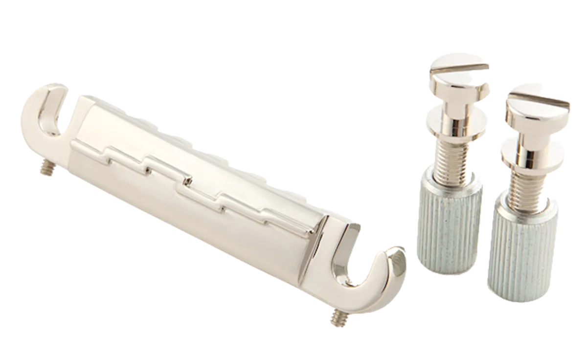 From the Genuine Gibson Historic Series, this "lightening bar" wrap around combination bridge/tailpiece comes in a nickel finish and includes studs and 1/2" (13mm) body inserts.
