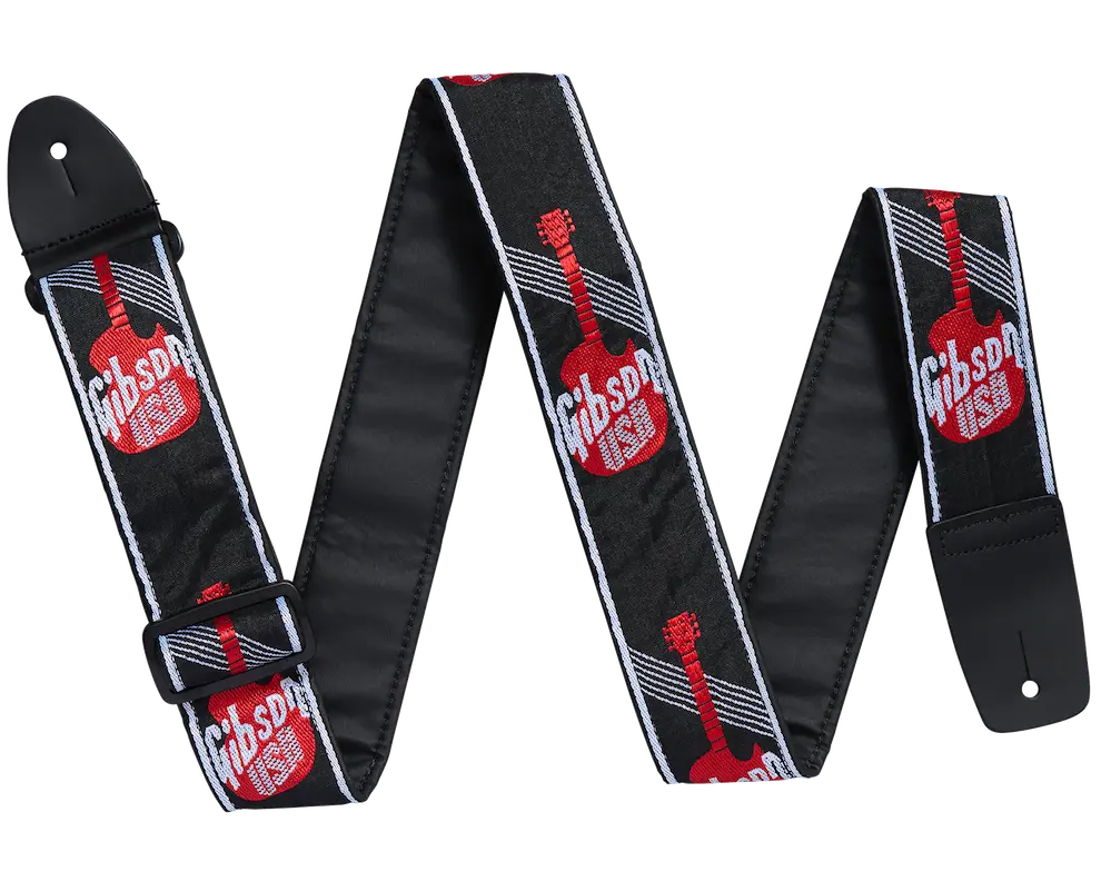 The high-quality, 2"-wide woven guitar strap is covered in vintage Gibson USA logos, placed over the timeless silhouette of a Les Paul Standard guitar.