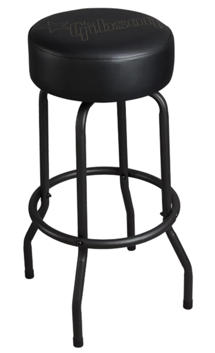 This 30" high playing stool features a comfortable, padded vinyl seat that swivels through 360 degrees and that is adorned with the Gibson Star logo. The classic barstool-style tubular steel legs have a matte black finish, and the stool has a foot ring for added comfort.