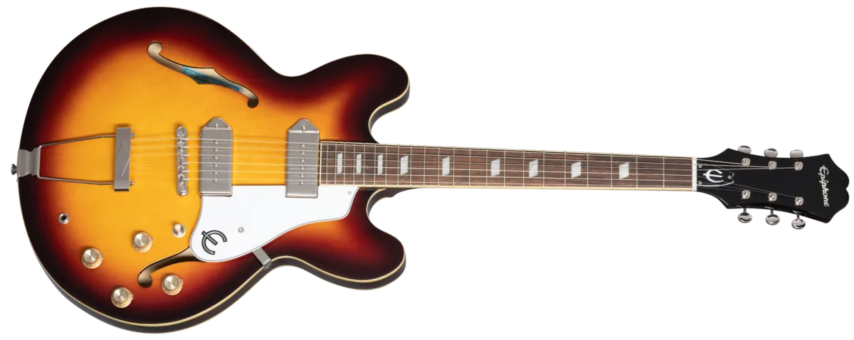 Since 1961, the legendary Casino ™ has been Epiphone's best-selling archtop and a rock n' roll standard. First introduced in 1961, the Casino was just one of several new thinline archtops designed and produced at the company's adopted new factory in Kalamazoo. Michigan that it shared with one-time competitor and new partner, Gibson. The Casino was adopted by Keith Richards of The Rolling Stones who used a Casino to record the demo for "Satisfaction" at Chess Records in Chicago. Howlin' Wolf took a Casino on his first tour of the UK, appearing on Thank Your Lucky Stars. Shortly afterward, John Lennon and George Harrison bought Casinos for the Beatles' 1966 world tour. Featuring Dogear PRO P-90 pickups and 5-ply maple body. Available in Natural and Vintage Sunburst.