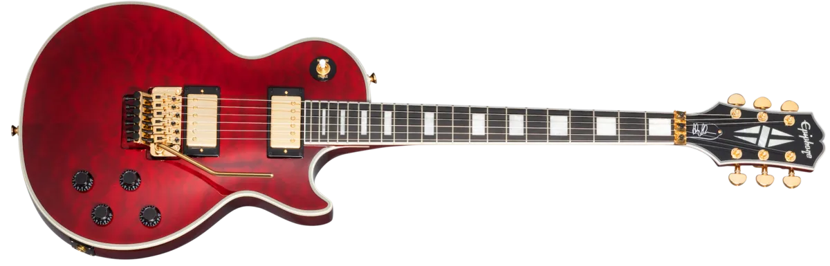 Created through extensive work with Alex Lifeson and Gibson™, Epiphone's Alex Lifeson Les Paul™ Custom Axcess similarly redefines the boundaries of the classic Les Paul in an accessible, versatile package. This guitar carries all of the traditional tones that have made the Les Paul legendary, along with unprecedented levels of sonic and performance agility. The Alex Lifeson Les Paul Custom Axcess Standard carries powerful Epiphone Ceramic Pro™ neck and ProBucker ™ 3 bridge pickups with push/pull coil splitting on the volume controls, along with a Floyd Rose® 1000 Series tremolo -the world's most efficient vibrato.