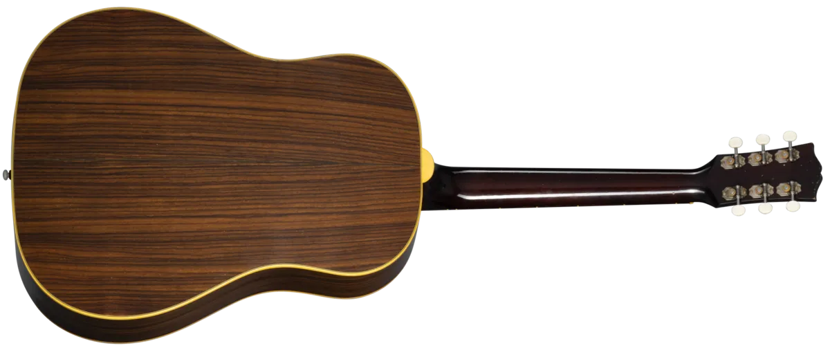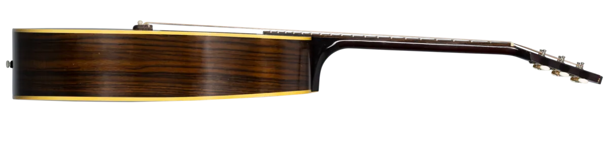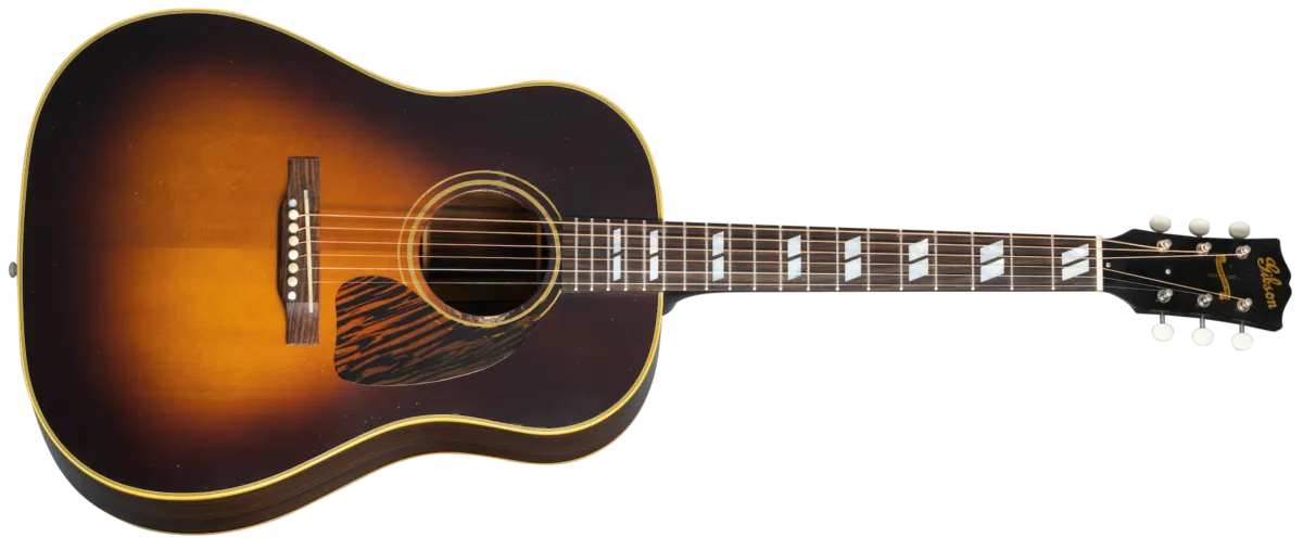 The Custom Shop Murphy Lab 1942 Banner Southern Jumbo features the vibe of a vintage Gibson Acoustic that has been well cared for for generations. The thermally aged Adirondack red spruce top and rosewood back and sides have outstanding tonal response and superior playability. At home playing first-position chords or picking lead blues licks, the Southern Jumbo is a versatile instrument. Proudly displaying the "Only a Gibson is Good Enough" banner on the headstock, this custom instrument also includes an open slot bridge, an aged bone saddle and nut, and the classic 1.77" nut width. It features Light Aging by the skilled artisans of the Murphy Lab. The Murphy Lab Light Aged finish treatment, paired with lightly aged hardware, simulates decades of light play wear, giving it the unique character, vibe, and feel of an original example from the Gibson Golden Era.