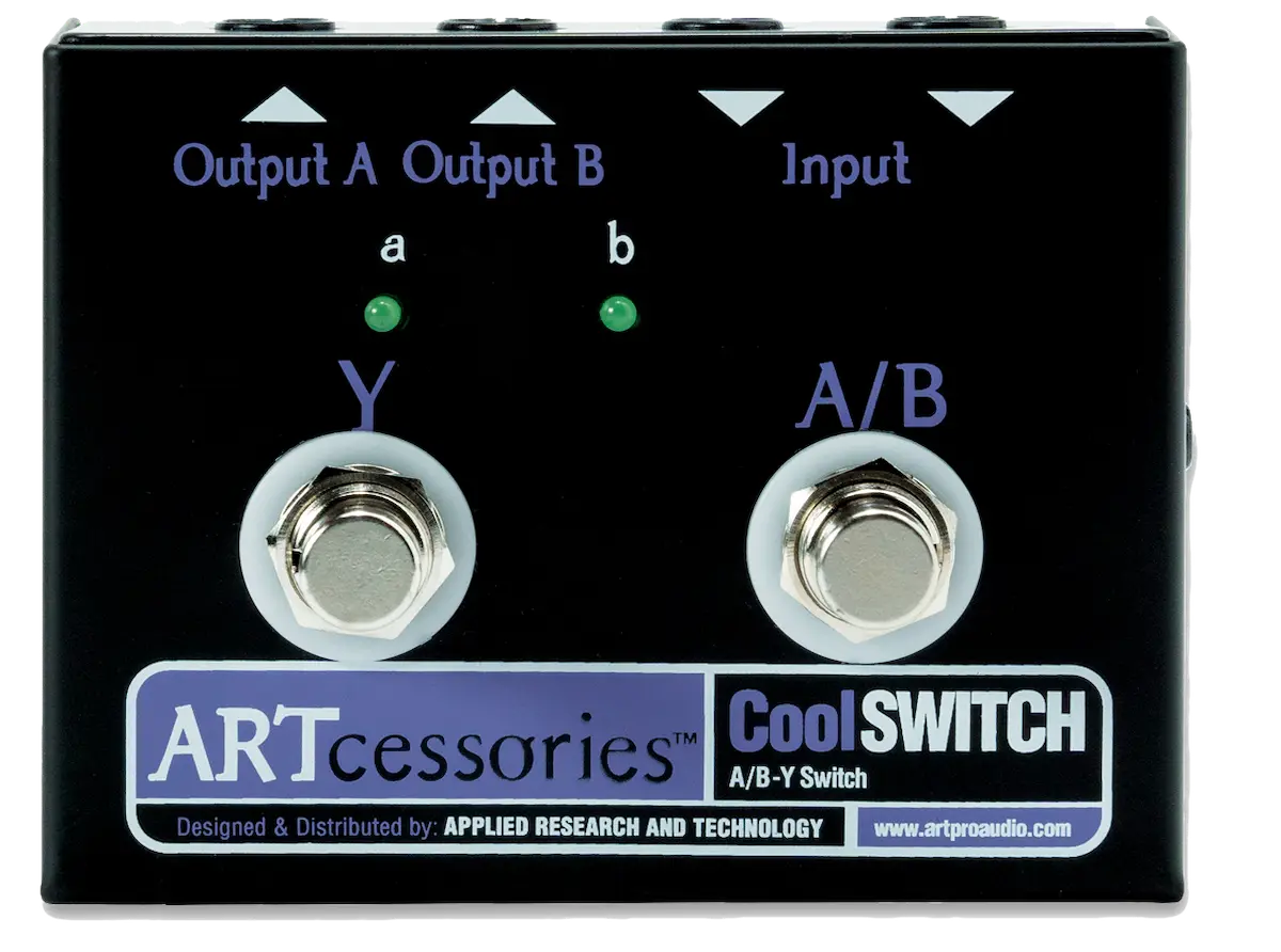 A/B-Y switching works two ways. It lets you switch a common source signal (guitar, bass or keyboard) between two amplifiers or amp channels. Or conversely, it lets you switch two source signals (ie, two different guitars) into the same amplifier. A good quality A/B-Y switcher will also provide LEDs or other indicators to show whether A, B or Y routing is in effect. The Y routing combines both the A and B outputs in parallel so that two amplifiers can be driven at once. The CoolSWITCH provides full A/B-Y switching functionality, plus parallel Common in/out jacks.