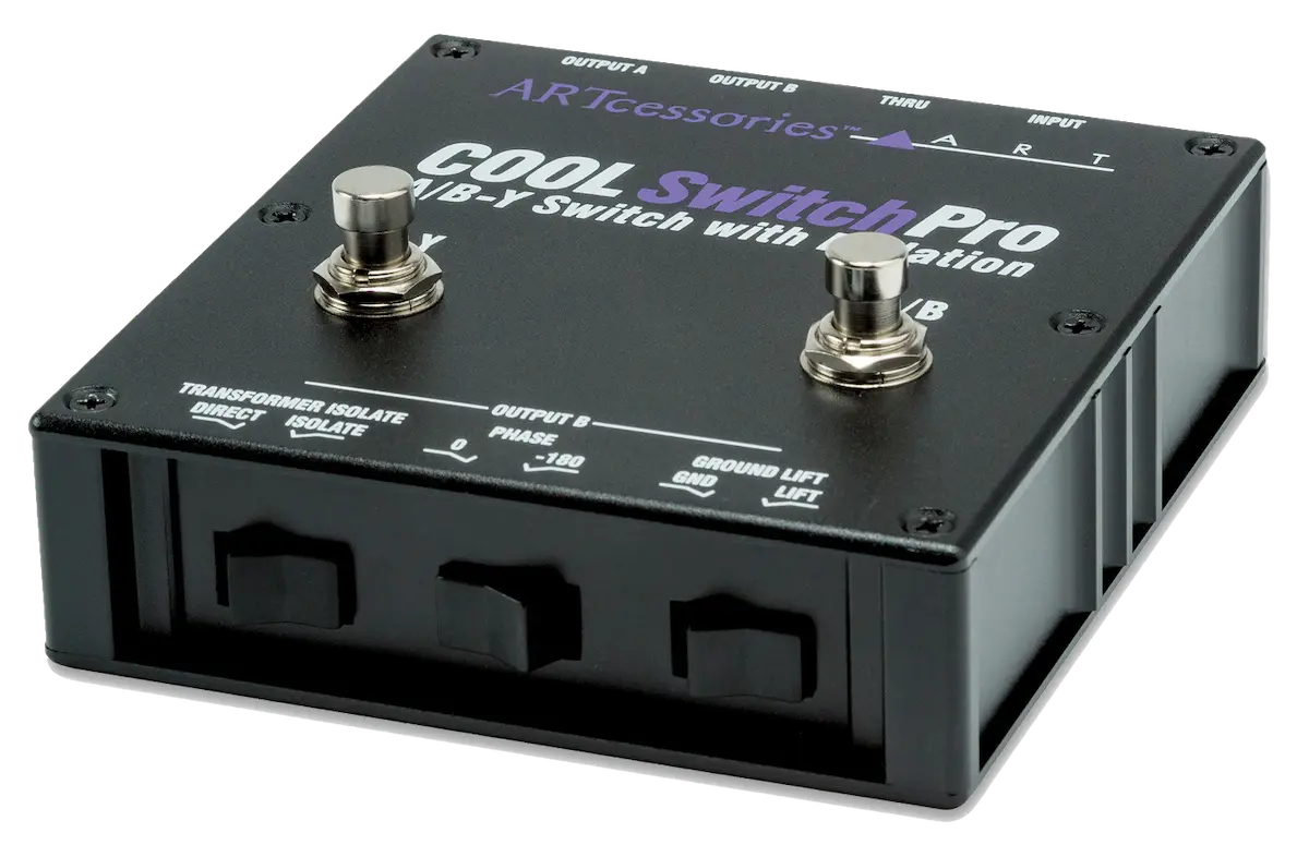 The ART COOLSwitchPro A/B-Y Switch with Isolation is a handy foot-operated box that lets you switch an instrument signal (guitar, bass, or keyboard) to either of two amplifiers or amp channels, A or B. The “Y” function sends the input signal to both the A and B outputs in parallel.