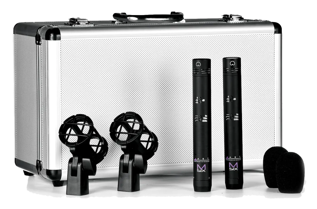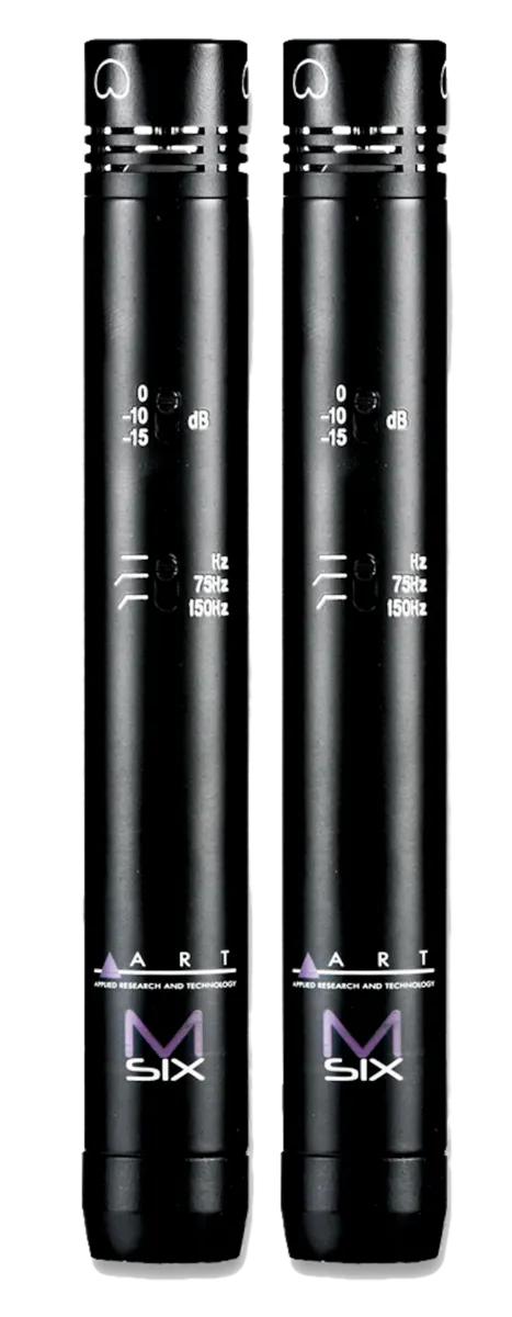 ART M-Six Stereo package contains a matched pair of ART high performance M-Six Pencil Condenser microphones. Ideal for capturing any stereo source with precision and accuracy, the M-Six has three position pad (at 0, -10 and -15dB) and three position -12dB /octave high pass filter (flat, 75Hz or 150Hz) ensures added flexibility when tracking critical sources.