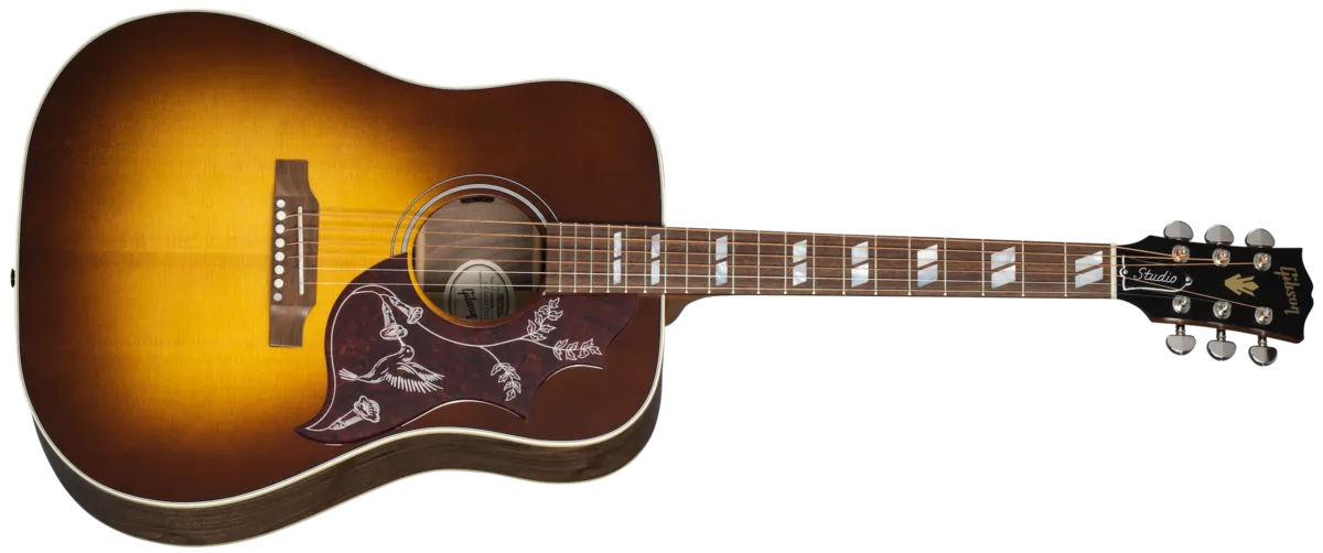 The Hummingbird ™ Studio Walnut continues Gibson's long history of producing world-famous square shoulder body designs, such as the Hummingbird, Dove™, and Songwriter models. The updated Hummingbird Studio Walnut is hand-built using all solid tonewoods and iS equipped with an Advanced Response profile utile neck for smooth, easy playability. It features a full-depth body for enhanced tonal response and a satin nitrocellulose finish, giving the look and feel of a long-treasured musical companion. Satin Natural and Satin Walnut Burst finishes, the Hummingbird Studio Walnut has an L.R. Baggs™ Element Bronze active under-saddle piezo pickup for easy studio-quality plug-and-play anywhere. Packaged in an included hardshell case for portability, this is the Hummingbird you've been waiting for!