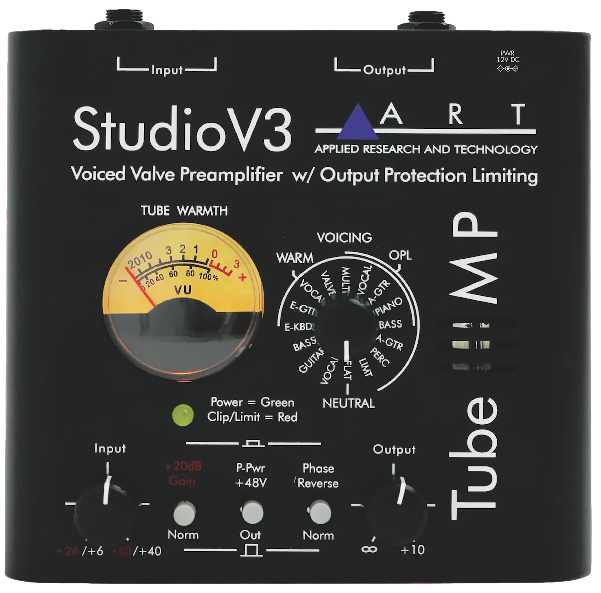The Tube MP Studio V3 delivers warmth and fatness to any audio source while maintaining an exceptionally low-noise signal path. While its primary function is as a microphone preamp with +48V phantom power, variable gain and phase reverse switching, the Tube MP is also an exceptionally versatile tube driven direct box for any instrument source. The Tube MP Studio V3 uses ART’s proven V3™ (Variable Valve Voicing) Technology to instantly contour the tone to any source.