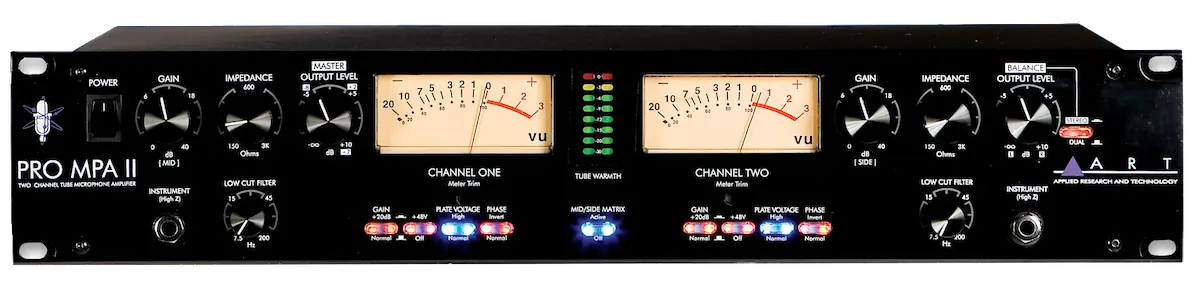 The new ART ProMPA II is the next generation in affordable high performance microphone preamp technology. Each microphone input circuit, with selectable 48v phantom power, features variable input impedance which can radically vary the overall performance of any high quality dynamic or ribbon microphone. The ProMPA II can be configured for dual mono or stereo operation with selectable mid/side mic support, summing the adjacent channel, to decode left/right signals.