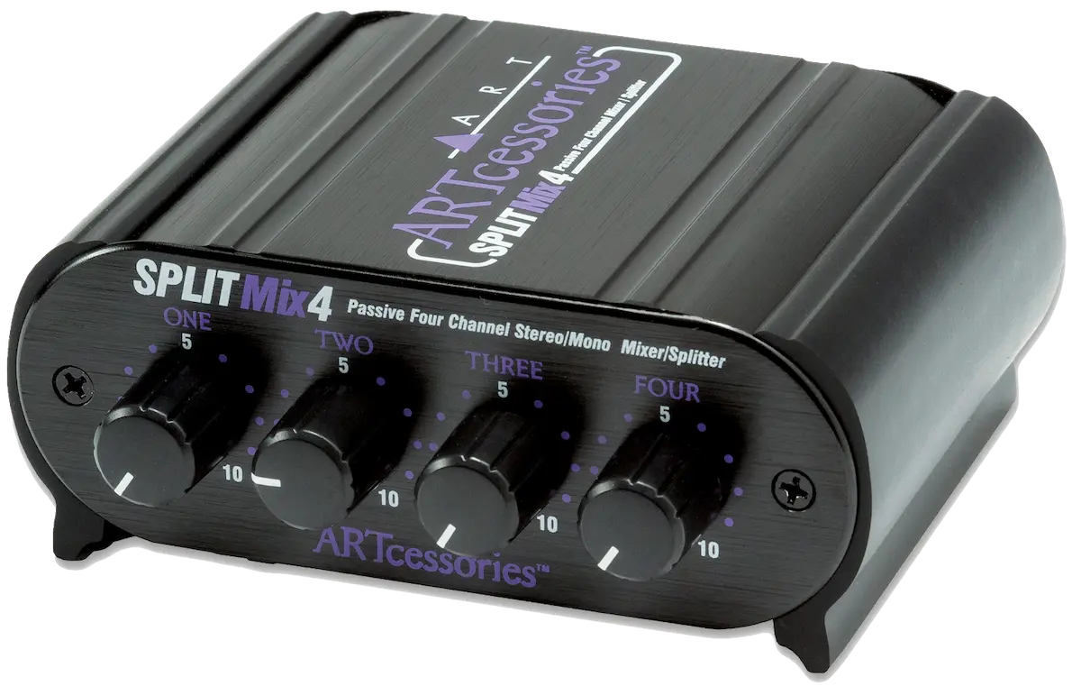 The SPLITMix4 is a fully passive hybrid mixer that offers a wide variety of configurations. Mix 4 stereo input channels down to 1 stereo output, split a stereo input signal to distribute 4 stereo output channels, or combine the configurations for a wide range of applications. You can even configure the SPLITMix4 as 4 stereo input channels thru 4 independent level attenuators to 4 stereo output channels.