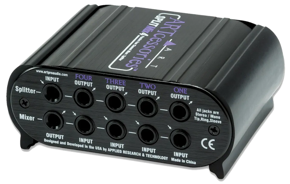 Independent stereo level controls are provided on each channel. All 1/4-inch connections are stereo TRS (Tip, Ring, Sleeve) and all channel connections have intelligent switching to allow for a wide variety of configurations. Plugging into a mix input channel removes it from the splitter bus, and plugging into a splitter output channel removes it from the mix bus. Stereo or mono operation is determined by the type of 1/4-inch plug and cabling that you use.