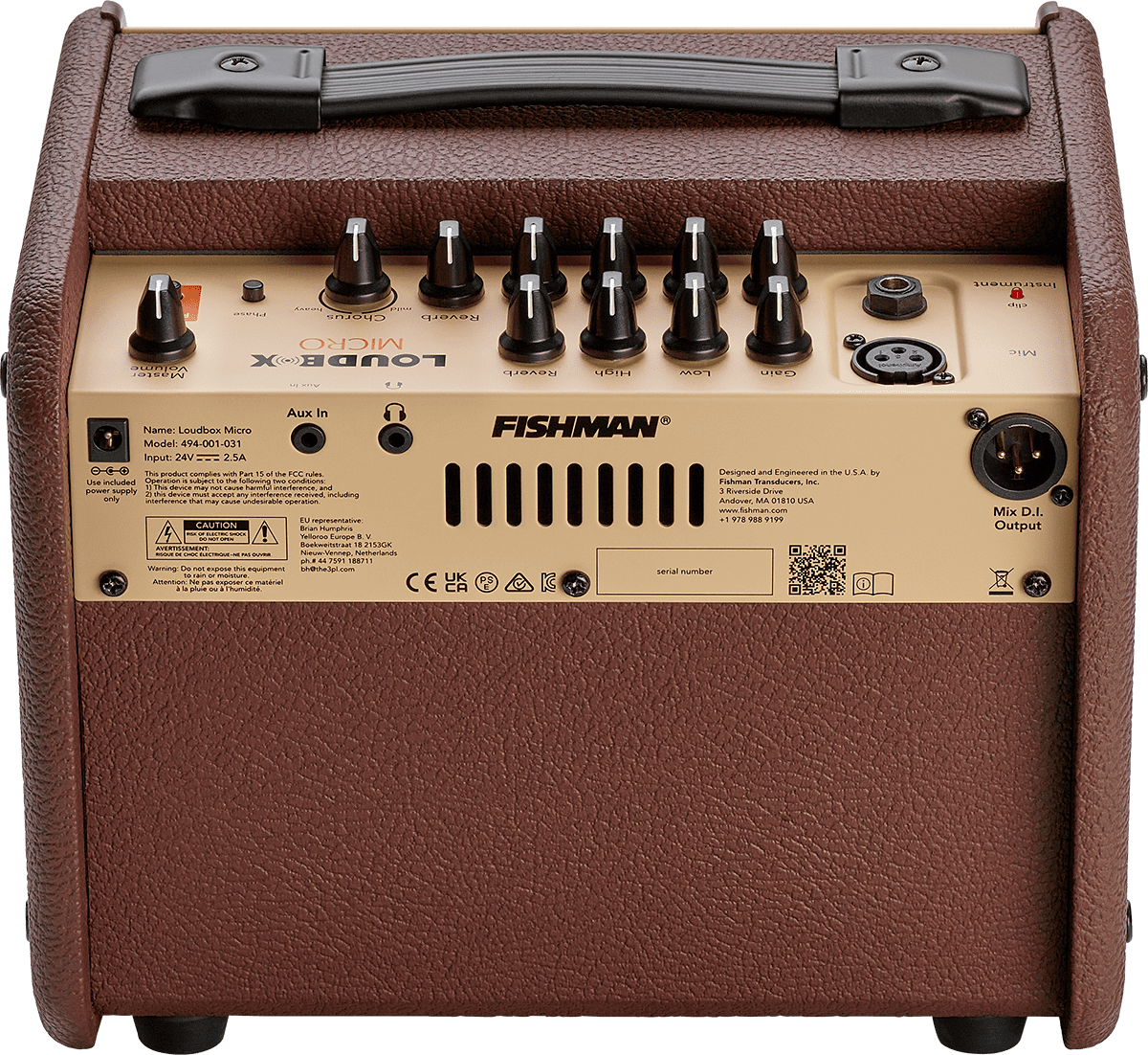 Use the high-quality digital reverb and chorus onthe instrument channel to create space and textures while reverb is there for the ready on the microphone channel. Loudbox Micro also includes an aux input, a balanced XLR D.I. output, and a headphone jack when you want to play quietly.