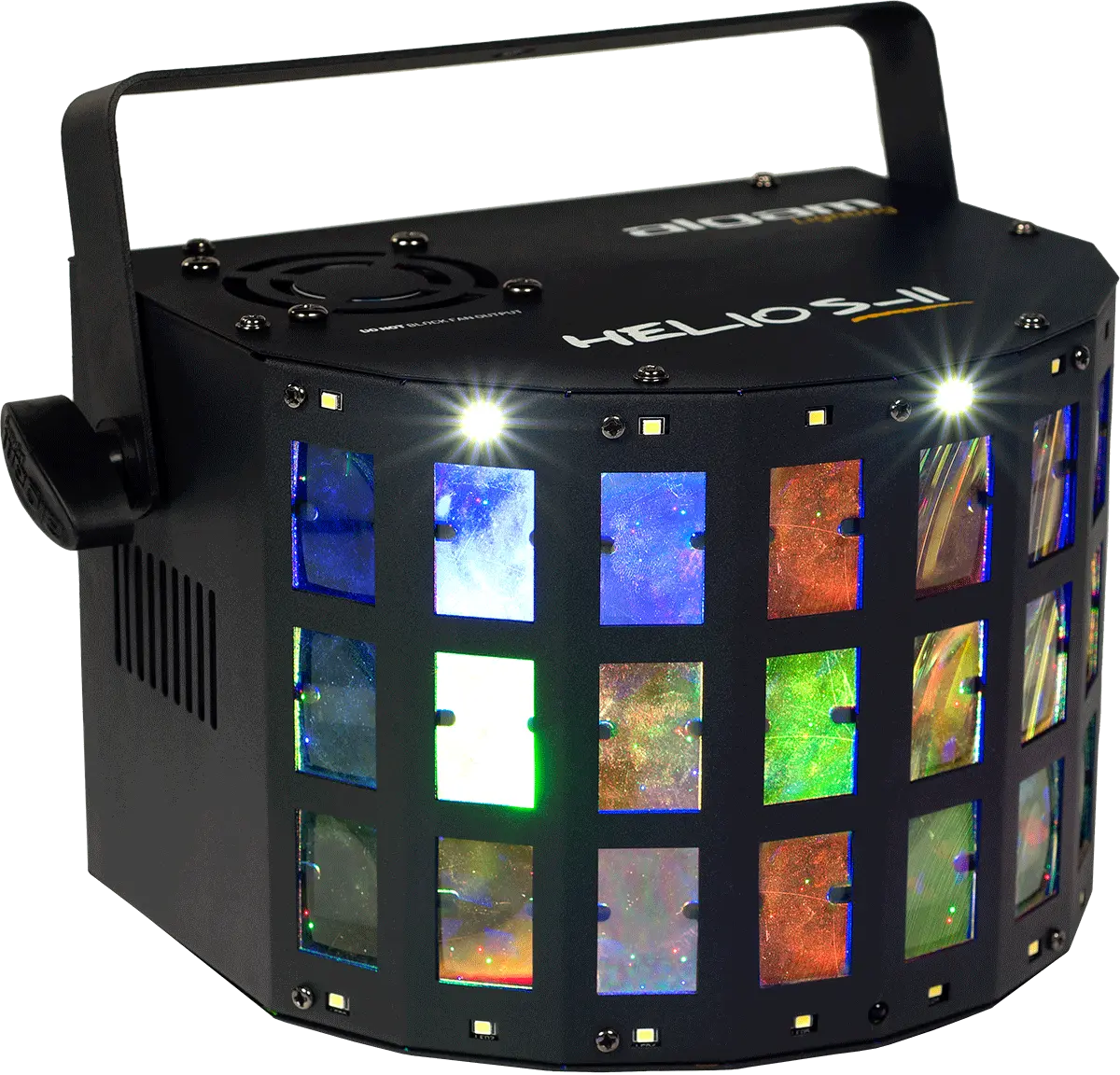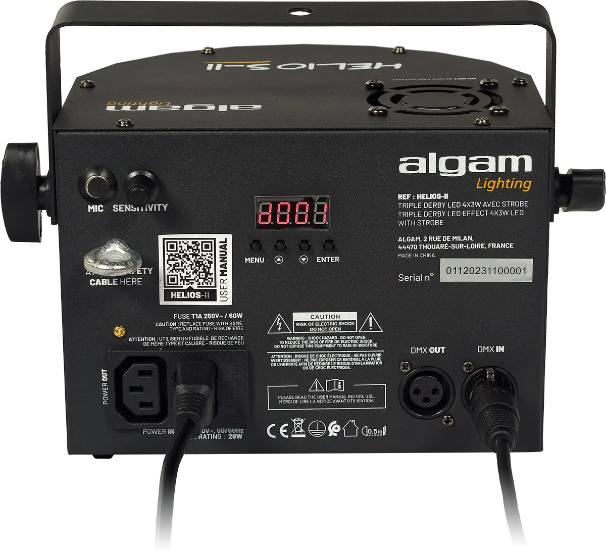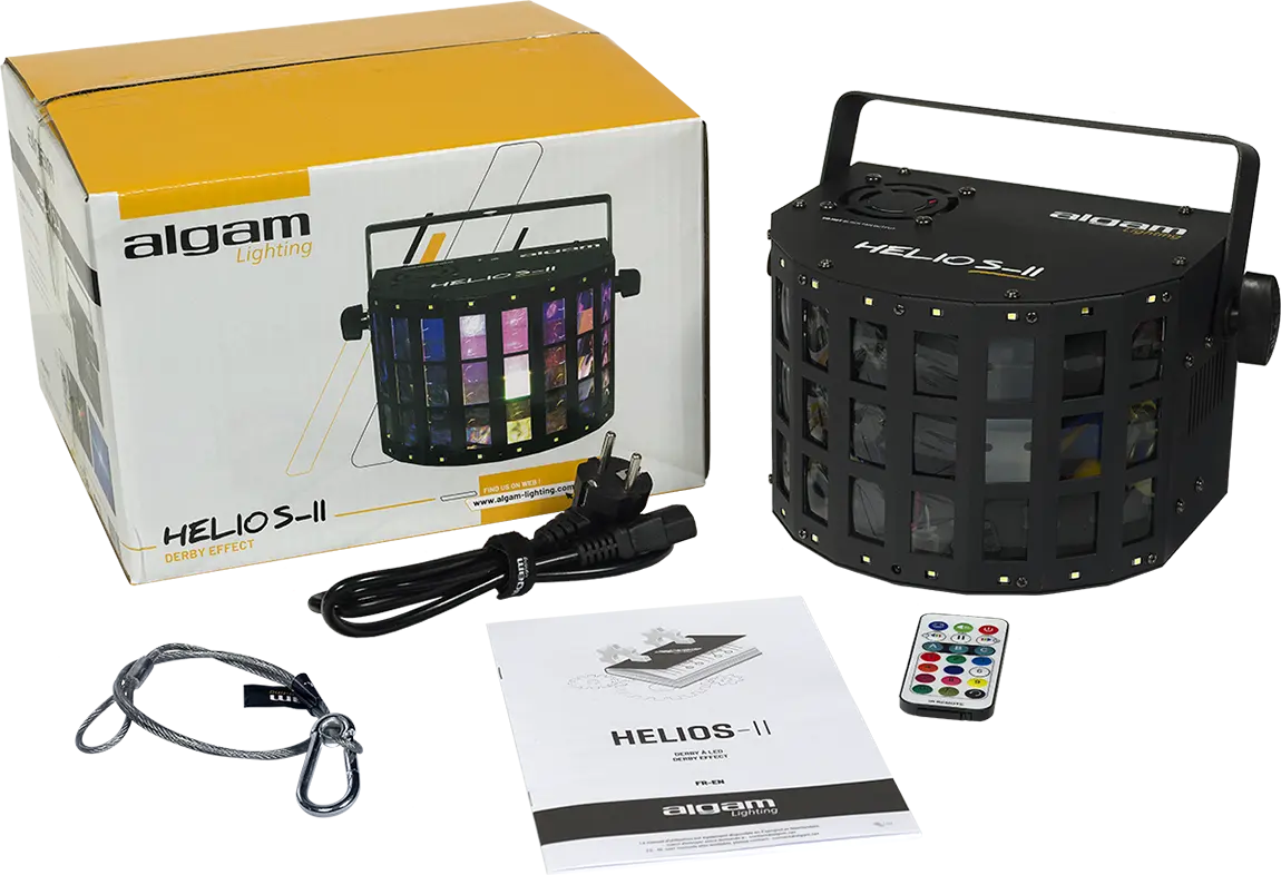 The Helios II has been designed to be immediately usable, without long and tedious configuration. With the supplied remote control or via the product's digital display, choose the desired operating mode in a matter of moments between Automatic, Automatic with Music Detection, Derby mode only, Strobe mode only, change colors and adjust program speed as you wish! For more advanced users looking for a more personalized performance, the Derby features a DMX interface operating on 1 or 4 channels, ideal for precisely setting colors, motor speed, strobe and scenarios.