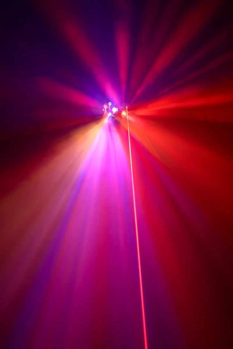 The FX-4 by Algam Lighting is a versatile 4-in-1 light system designed to instantly switch the mood to "Party Mode" in a heartbeat to any event. Despite its compact size and affordability, this all-in-one lighting system packs a punch. features a 6x3W RGB LED gobo wheel that projects various light patterns onto the dancefloor, as well as a 3x3W Magic Ball that diffuses sparkling light effects for a warm and festive ambiance. In addition, the FX-4 includes a multipoint red/green laser that projects multiple beams throughout the room and a stroboscope effect that offers a wide range of dynamic effects. The FX-4 is easy to use, thanks to its automatic mode and music detection mode, which eliminates the need for tedious programming. However, advanced users can take advantage of the 14 DMX channels available to fine-tune the control of this feature-rich combo.