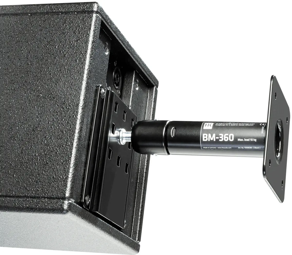 With the 360°-rotatable bracket BM-360, a loudspeaker such as the FINEO FO 5, can be installed on a wall, ceiling or surface.The tilt angle can be adjusted continuously on all axes to ensure perfect alignment of the loudspeaker even in difficult environments to ensure pertect alignment of the speaker even in architecturally difficult environments.