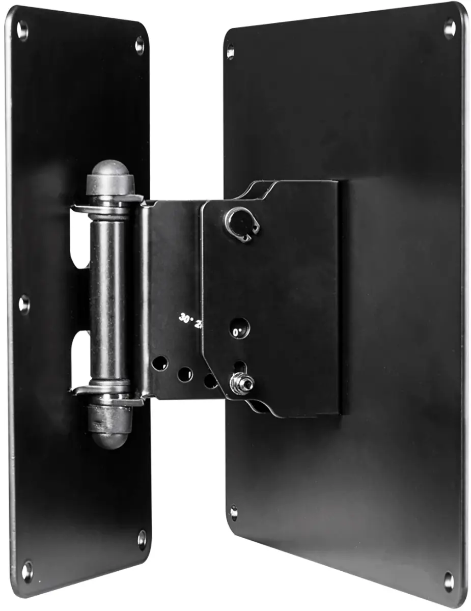 The swivel and tilt wall bracket L is used to mount a FO12 or FO15 speaker on a wall. The bracket allows the speaker to be rotated continuously horizontally and tilted vertically in 10° increments from 0° to 30°. The swivel and tilt wall mount L is attached via the VESA hole pattern (MIS-E) on the back of the cabinet.