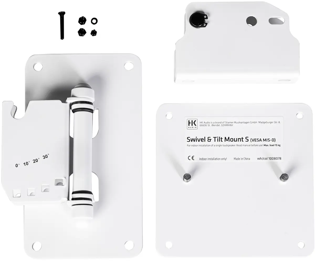 The swivel and tilt wall mount S (VESA MIS-D) can be used to mount a FO5, FO 8 or FO10 speaker on a wall. Together with the swivel and tilt bracket, the speaker can be continuously rotated horizontally and tilted vertically in 10° increments from 0° to 30°. The swivel and tilt wall mount S is attached via the VESA hole pattern (MIS-D) on the back of the speaker.