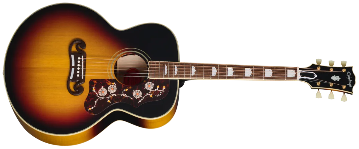 The world-famous SJ-200 is known as the "King of the Flat-Tops," and It's been the choice of countless legends, from singing cowboys to country, folk, and rock icons, right up to some of today's most popular artists. Now Epiphone, in collaboration with the Gibson Custom Shop, is proud to release the 1957 SJ-200. This impressive guitar features a thermally aged solid Sitka spruce top supported by scalloped X-bracing, solid figured maple back and sides, and a flame maple neck with a C-profile, laurel fretboard, and graduated crown mother of pearl inlays. The headstock has the Gibson "open book" shape, along with a mother-of-pearl crown and Epiphone logo inlays, and the Inspired by Gibson Custom double diamond logo etched into the back. The iconic J-200 open moustache bridge and engraved pickguard are also present, along with a compensated bone saddle, bone nut, and bone bridge pins. It even comes equipped with an L.R. Baggs™ VTC preamp and under saddle pickup, sO it's ready to rock on stage or in the studio as soon as you take it out of the included Inspired by Gibson Custom hardshell case.