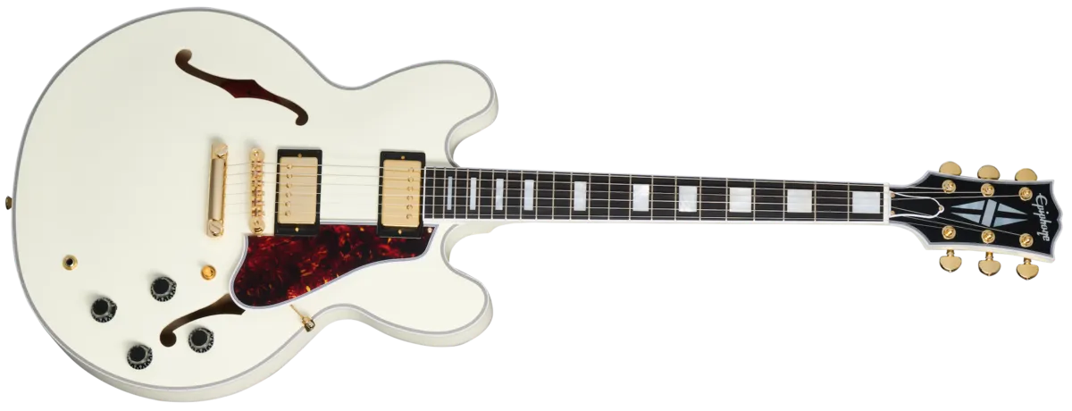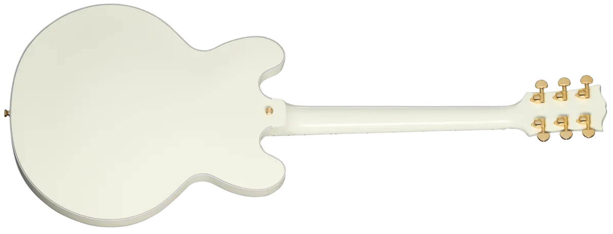 In partnership with Gibson T Custom, Epiphone is proud to release the 1959 ES-355, a stunning recreation of the preeminent ES™ model from the legendary class of 1959. It's the top-of-the-line ES model in all its glory, from the dimensions to the contours to the precise inlay patterns and sonic experience. The 1959 ES-355 features a 5-ply layered maple/poplar body with a solid maple centerblock for sustain and feedback resistance, a one-piece mahogany neck with a 50s Rounded Medium C profile, and an ebony fretboard that is adorned with block mother of pearl inlays. The Gibson-style "open book" headstock features the Split Diamond and Epiphone logo inlays in mother-of-pearl, along with gold Grover® Rotomatic® tuners and the Inspired by Gibson double diamond logo etched on the back. The 1959 ES-355 is powered by a pair of Gibson Custombuckers that are hand-wired to CTS® potentiometers, Mallory™ capacitors, and a Switchcraft® pickup selector switch and output jack. A brown and pink hardshell case with the Inspired by Gibson Custom logo is also included.