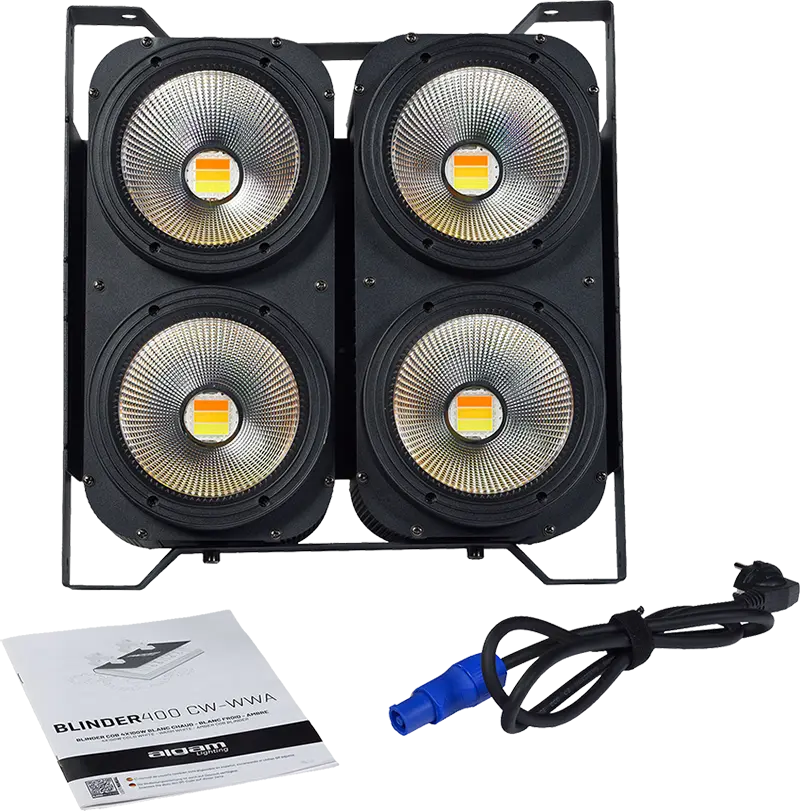 Looking for a powerful lighting system capable of creating that dazzling blinder effect on stage? The BLINDER 400 CW-WWA from Algam Lighting is the right choice for you! Designed around 4 powerful 100W COB LEDs, this impressive blinder can generate a palette of whites ranging from cool white to warm amber hues similar to traditional halogen lamps, thanks to a combination of cold white/warm white/amber COB LEDs. DMX controlled via 7 or 16 channels, the BLINDER 400 CW-WWA allows precise individual adjustment of the intensity and color of each LED, and offers different effects for greater versatility.