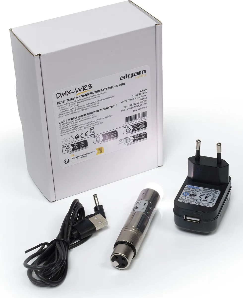 Say goodbye to cumbersome cables and enjoy total freedom in controlling your lighting systems thanks to the DMX-WRB, an incredibly efficient battery-powered wireless DMX receiver. This compact, lightweight receiver, operating in the 2.4 GHz band, provides a reliable wireless connection with a range of up to 400 meters, giving you total freedom to control your light shows.Maximum installation flexibility.DMX-WRB's 2.4 GHz wireless technology gives you unprecedented installation flexibility for your DMX-compatible lighting systems. Set up and control your lighting systems wherever you like, and control them from any point in your show without constraints, thanks to the 400 m range and built-in battery in each receiver, offering up to 20h autonomy. A power supply is also included for easy recharging.Unbeatable simplicity.DMX-WRB stands out for its disconcerting ease of use. Its Plug & Play system means it can be set up in the blink of an eye, without tedious installation or complex configuration. Simply connect your transmitter (such as a DMX-WT) to a DMX remote control and your DMX-WRB receiver to your lighting system, switch them both on, press the flush-mounted Group button on the DMX-WRB for 4 seconds to start pairing, and finish by pressing the Group button on the transmitter: synchronization takes just a few moments!