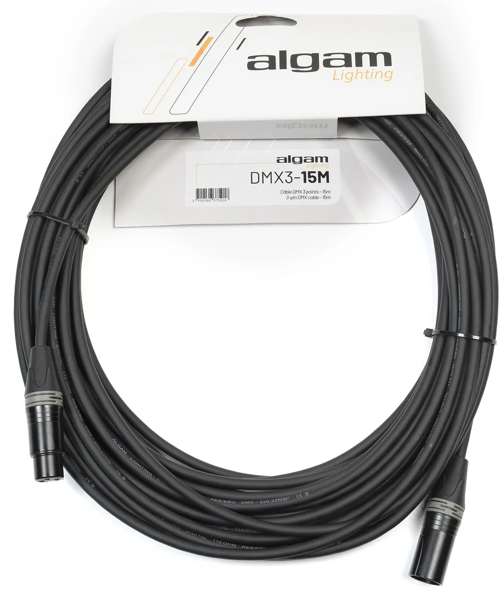 This 15 m 3-pin DMX cable developed by Algam Lighting is the ideal solution for connecting your DMX console to your lighting machines, or for creating chains between spaced systems on a stage or light rig. Robust and reliable, it guarantees optimum DMX signal transmission thanks to its 110Ω impedance, while its 3-point connection makes it ideal for both amateur and advanced lighting systems.Control your DMX lighting systems with confidenceWould you like to control your DMX-interfaced lights with precision and put on your own light shows? This 3-pin DMX cable is an indispensable link between your DMX console and your lighting systems. Featuring 3-pin connectors suitable for most amateur and professional lighting systems, this robust and affordable 15 m DMX cable is perfect for connecting your lighting machines on your shows and events.Precise specificationsDesigned to meet the precise specifications required by the DMX protocol, this DMX cable offers a characteristic impedance of 110Ω via two 0.22 mm² conductors, for reliable, efficient DMX signal transmission in professional lighting installations.