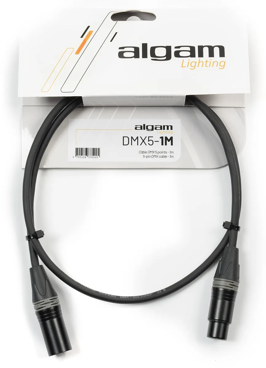 This 1m, 5-pin DMX cable developed by Algam Lighting is the ideal solution for connecting your DMX console to your lighting machines, or for creating chains between machines on a stage or structure. Robust and reliable, it guarantees optimum DMX signal transmission thanks to its 110Ω impedance, while its 5-point connection makes it ideal for professional lighting systems.