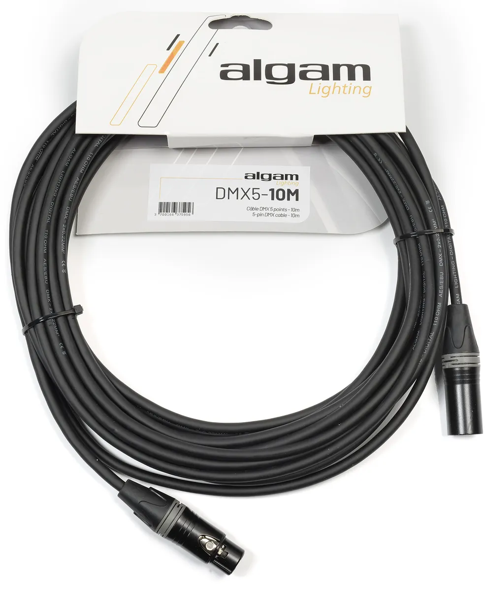 This 10m 5-pin DMX cable developed by Algam Lighting is the ideal solution for connecting your DMX console to your lighting machines, or for creating chains between machines on a stage or structure. Robust and reliable, it guarantees optimum DMX signal transmission thanks to its 110Ω impedance, while its 5-point connection makes it ideal for professional lighting systems.