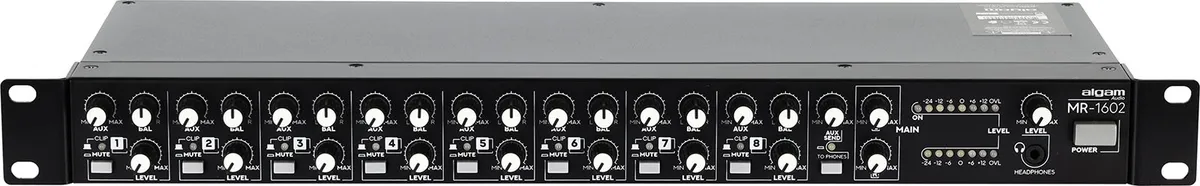 The Algam Audio MR-1602 8-channel rack-mountable analog mixer is a versatile tool designed to meet the needs of audio professionals. With its eight stereo channels, this mixer offers exceptional flexibility for a wide range of applications, from studio recording to live sound, as a sub-mixer for stereo sources requiring multiple inputs. Its compact 1U rack-mount format makes it an indispensable tool on stage or in the studio.