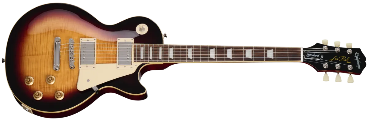 Epiphone's Inspired by Gibson™ Collection proudly presents the Les Paul™ Standard 50s! This guitar lovingly recreates the feel and tone of the 1950s-era Les Pauls. Epiphone's long friendship with Mr. Les Paul began in 1940 when Les built one of the world's first solidbody electric guitars while working nights at the original Epiphone factory in Manhattan. Les' first solidbody guitar, nicknamed "the Log," would go on to inspire the Les Paul Standard, which many consider the greatest electric guitar ever made. This guitar is crafted with a mahogany body, maple cap with AAA flame maple veneer, bound '59 Rounded Medium C-shaped mahogany neck with long neck tenon, laurel fretboard with classic trapezoid inlays, Epiphone's Vintage Deluxe tuners, a pair of critically acclaimed Epiphone Probucker™ humbuckers™, and gold Top Hat knobs with dial pointers. This Epiphone Inspired by Gibson Original model also has the Kalamazoo headstock, Graph Tech® nut, era-appropriate wiring, and CTS® pots. A premium gig bag IS also included.