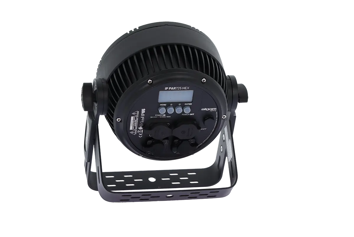With IP65 protection, the IP PAR 725 HEX is equipped with sealed connectors on the machine, and comes with PowerCon and DMX IP power cables to prevent any infiltration into the connectors. A full-featured fixture, it can operate in automatic mode, react to ambient music, be controlled via a DMX controller or a master device, and can also be parameterized via the keypad on the back.