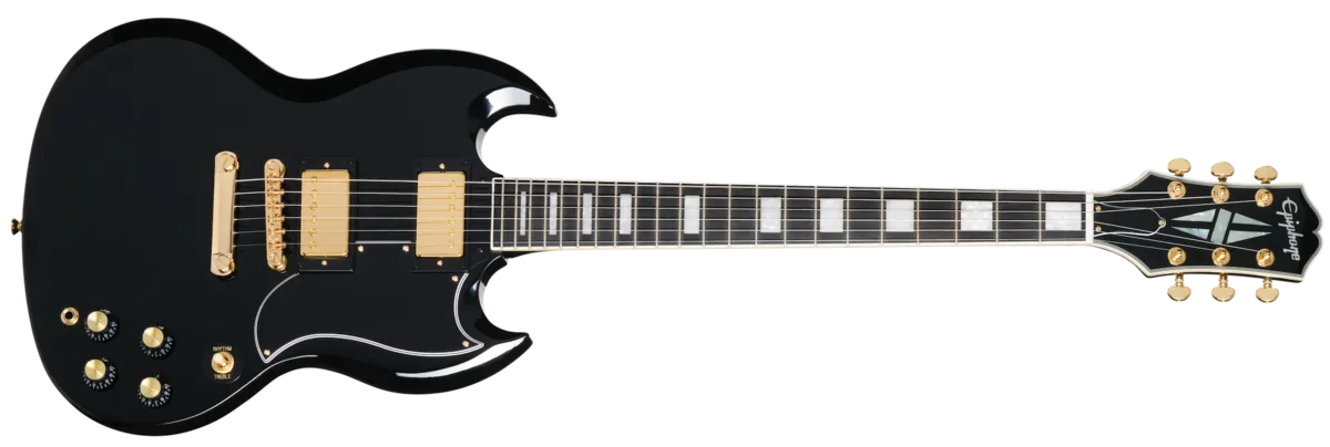 Part of the Inspired by Gibson Collection, the Epiphone SG Custom has been refreshed and is better than ever. The legendary SG™ has long been a favorite of musicians across genres. Like the Custom version of the Les Paul, which Les himself envisioned as a fancier, "tuxedo" version of his legendary solidbody model, the SG Custom also features the premium appointments that can be found on all Custom models. The Epiphone SG Custom has a contoured, double-cutaway mahogany body that delivers exceptional access to all 22 frets. The glued-in mahogany neck adds to the model's renowned sustain. The neck has a 1960 Slim Taper C profile that isn't quite as thin as some Slim Taper neck profiles but is still fast and comfortable to play. The neck is capped with a bound ebony fretboard equipped with 22 medium jumbo frets and is adorned with Custom pearloid block inlays. The 12" fretboard radius is equally comfortable and well suited for first-position chording and for string bends further up the neck without the risk of your bends fretting out. The Epiphone SG Custom is outfitted with gold hardware throughout, right down to the gold inserts on the black Top Hat control knobs. The bound headstock has Grover® Mini Rotomatic® tuning machines and is adorned with the Epiphone logo and Custom Split Diamond inlay, both in mother of pearl. The Grover tuners, Graph Tech ™ nut, and the fully adjustable Epiphone Lock Tone ™ Tune-O-Matic™M bridge and Stop Bar tailpiece all work together to keep the tuning stability and intonation on point. The Epiphone SG Custom is equipped with a pair of Epiphone ProBucker™ Custom humbucking pickups that deliver all of the vintage-approved SG tones you expect. Each pickup is wired to its own individual volume and tone control, along with a three-way toggle pickup selector switch, which lets you use either pickup alone or combine them in whatever ratio suits your mood and the musical moment. The Epiphone SG Custom is a refined and elegant model in formal attire that is well-suited for any occasion. Its stunning looks will turn heads, and its rich sound will impress players and fans alike. It comes complete with a premium gig bag to help keep it safe whether you're traveling to your next open mic night jam session, wedding reception, or club gig.